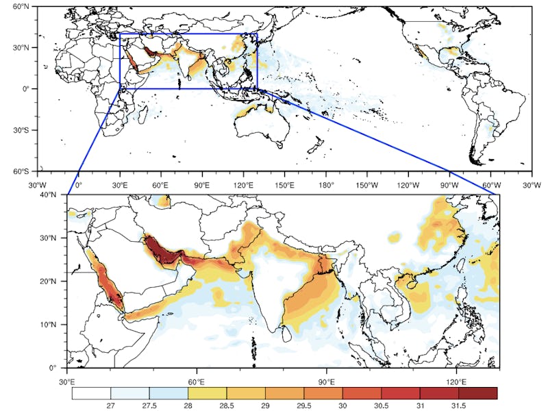 While most climate change studies look only at temperature, this one uses a different measure that accounts for the impact of humidity on the ability of humans to cool themselves off through sweating. It’s called wet-bulb temperature, and it measures how hot the air would be if cooled through the evaporation of water until it reaches 100 percent humidity.