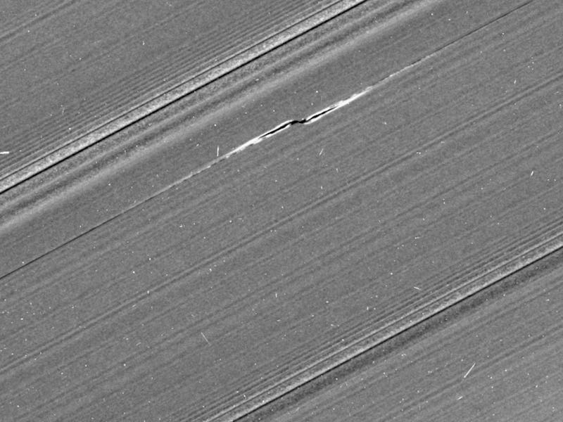 Scientists call these gashes “propellers.” As you can see in the photo above, the gashes are a bit crooked, like a plane’s propellers. When first analyzing the images thirteen years ago, Cassini researchers concluded that the propeller gashes “are much like the wave pattern that trails after a speedboat as it skims across a smooth lake.” Yet, Saturn’s rings are like no smooth lake. They’re much more varied and uneven, like a “choppy sea,” which would make the propellers difficult to find.