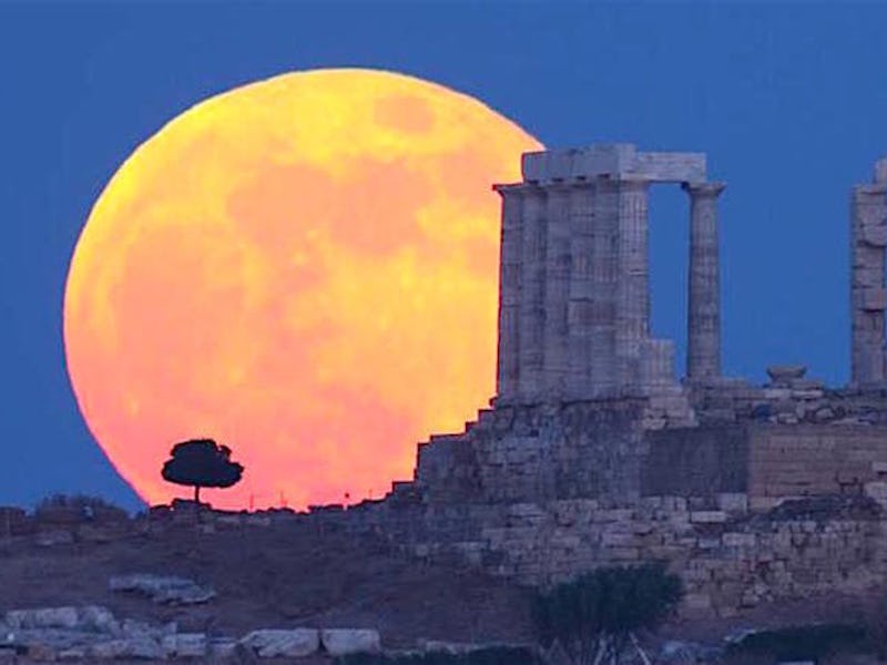 A giant, bloody moon appeared in the night sky over Europe, Africa, and Asia on August 7. In an image that has gone viral, a photographer captured the moon’s pronounced size as it hovered above the Temple of Poseidon in Athens, Greece.