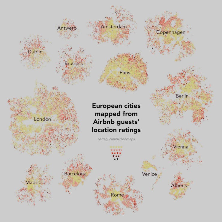 These days, Arregi is working on a project to visualize Airbnb rating data in cities around the world. He’s found that his experience in Athens seemed to play out on a statistical level, with dozens of Airbnb reviews downrating their accommodations on the north side of Athens, and more centrally-located hosts being lavished with stars. What’s more, the same pattern plays out in other cities around the world, thanks in part to the wisdom of crowds.