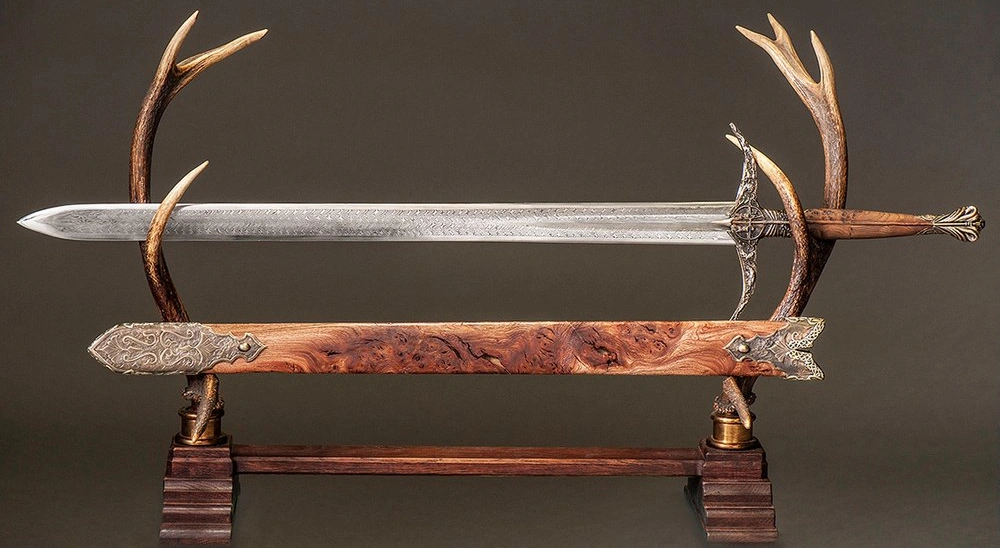 The crossguard of Heartsbane depicts the Tarly house sigil: the striding huntsman, aiming arrows towards the sigils of other Westerosi houses.