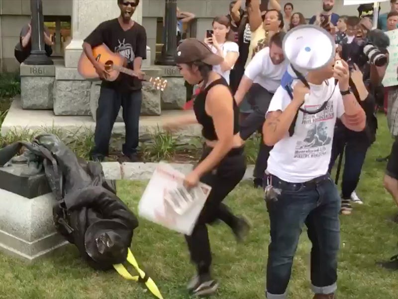 On Monday, protestors in Durham, North Carolina toppled a Confederate Army monument that stood outside the city’s county courthouse, in the tense aftermath of Friday’s white power rally in Charlottesville, which led to the death of one woman and many injuries. Footage of the statue’s destruction was posted to Twitter seconds after the event and went viral.
