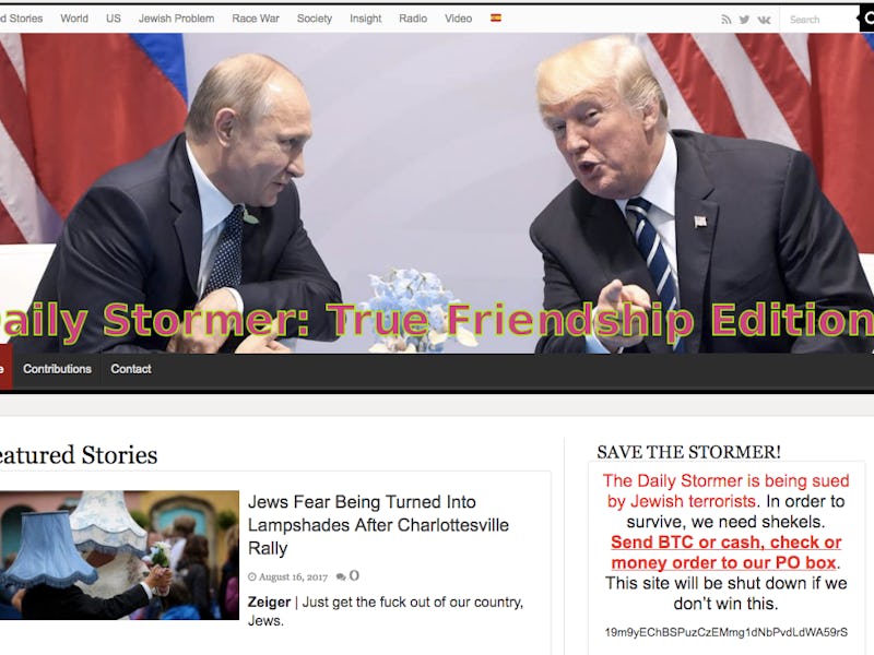 The Stormer, a violently anti-semitic and racist neo-Nazi website started by white nationalist Andrew Anglin, was cut adrift by its original website host, GoDaddy, on Monday. Google’s domain name service also refused to support the website, and it was forced to move to the “Dark Web,” a portion of the internet where websites are unlisted by typical search engines and usually only accessible with the Tor browser. On Wednesday, it appeared the Stormer had found a new home on the normal internet with a .ru domain — but its return to Russian-supported relevancy was short lived.