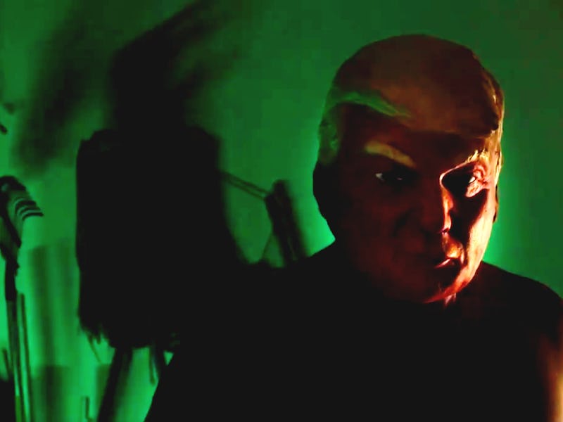 Rather than using the familiar, humming bass of seasons past, AHS has opted for a hauntingly upbeat song this season featuring trumpets and a circus-esque theme. As the trumpets trill out a creepy lullaby, images of faceless people donning Donald Trump and Hillary Clinton masks are joined by clowns crawling from coffins and bees scrambling in and out of honeycomb. This imagery is on point for what co-creator Ryan Murphy has been promising so far for this season, including a Presidential Election theme, political clowns, and plenty of references to the “hive mind” (bees, get it?) of cults and political factions.