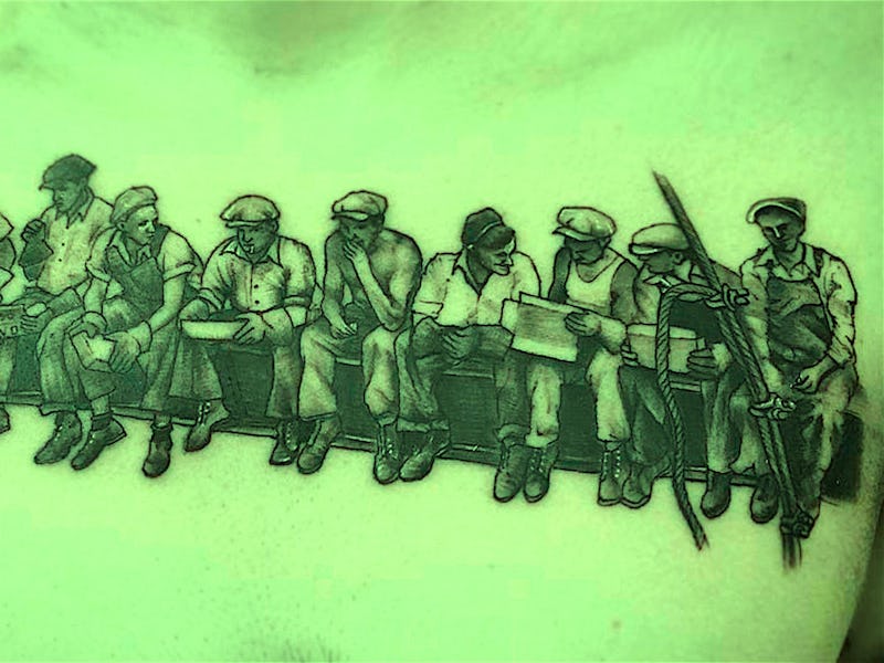 Sculptor Sergio Furnari paid tribute to the famous photo by TK, "Lunch Atop a Skyscraper," one of the most iconic representations of American labor. The original photo was shot on September 20, 1932, on the 69th floor of the RCA Building during the last months of construction.