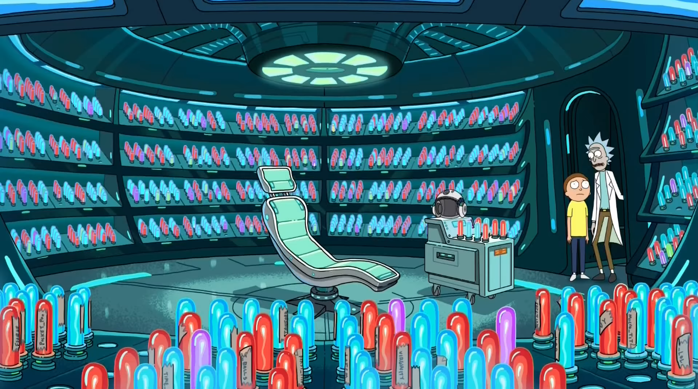 That’s when Rick reveals an entire subterranean lab beneath the garage for what he calls “Morty’s Mind Blowers.” Whenever Morty has a traumatic memory — or just a memory that Rick doesn’t want him to keep — Rick removes the memory and stores it in a glass vial, color-coded by the subject matter. (Red means Rick made a mistake or did something to Morty that Rick wants Morty to forget.)