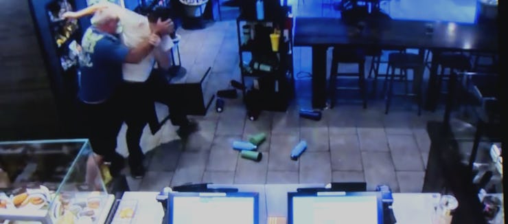 The entire incident was captured on video via security cameras, and quickly went viral. It isn’t extremely graphic but there is a brief blood spurt, so squeamish viewers should be advised: