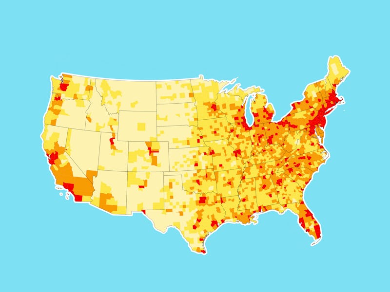 The red areas have 250 people per square mile, the orange 50-249, the yellow 10-49, and the light yellow less than 10.