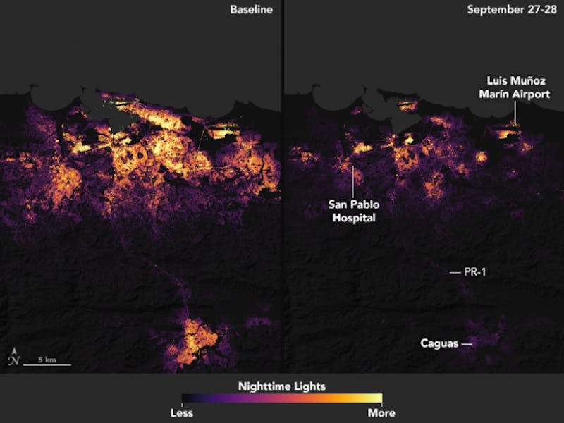 NASA’s before-and-after images are based on data collected from the Suomi NPP satellite. It’s equipped with a scanning radiometer that collects visible and infrared imagery and radiometric measurements, which means that as it passed over Puerto Rico, it was able to measure the emissions from cities and other human activity. Light from any non-electrical sources is filtered out in the creation of these maps, as well as atmospheric elements like dust, haze, and thin clouds.