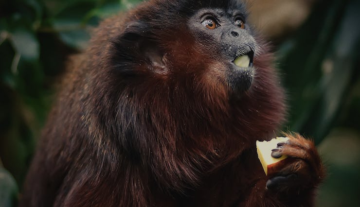 Vale, a four week old red titi monkey, sits on his mum Yara's back as he looks at his dad Thiago in the rainforest biome at London Zoo.
