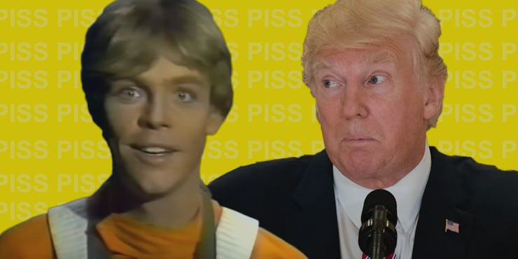 The original Star Wars cast is haunted by tape recordings of the infamous Star Wars Holiday Special. President Donald Trump is haunted by rumors of his own tape: alleged footage of him participating or facilitating a “golden shower” with some Russian prostitutes. The incident, which was included in a explosive dossier on Trump compiled by a former MI6 officer, has never been confirmed, but the president is understandably eager to discredit it. After tweeting about it over the weekend, Mark Hamill (aka Luke Skywalker) decided to give Trump some advice.