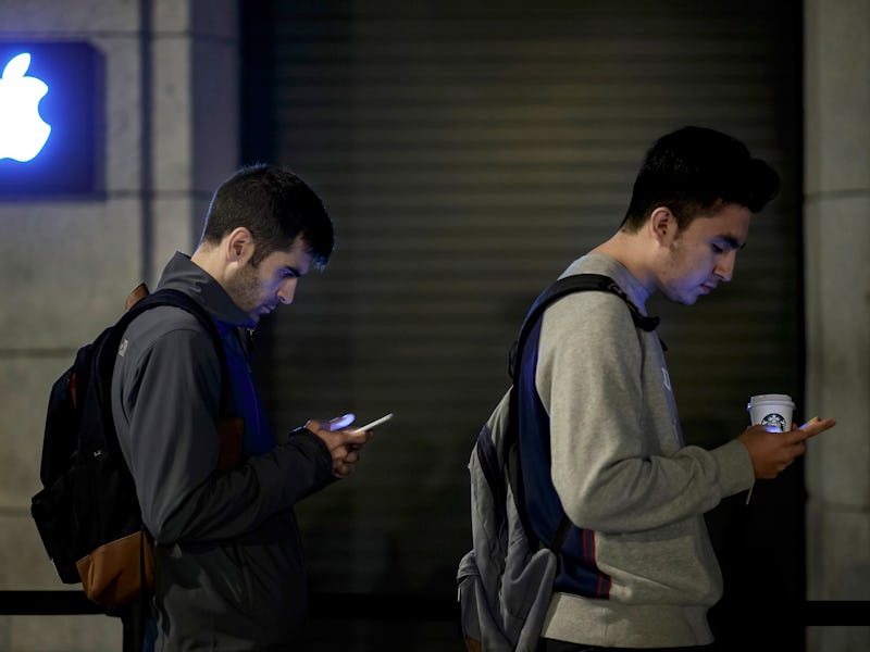 Customers take pictures with their mobile phones as they queue at Puerta del Sol Apple Store before its opening the day the company launches their Iphone 7 and 7 Plus on September 16, 2016 in Madrid, Spain.