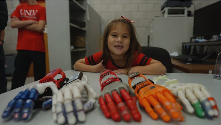 Engineers at UNLV use a 3D printer to create the prosthetic, a process that has to be done repeatedly as the Las Vegas girl continues to grow. They made her first one three years ago, when she was four. According to a fundraising page the engineering department has set up, the printer machinery costs about $60,000 and each hand costs $5,000. The school says it aims to expand its work with prosthetics to help more children in the area.