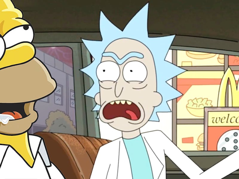 This isn’t even the first time Rick and Morty had some interaction with The Simpsons. In 2015, Rick and Morty appeared in a Couch Gag for The Simpsons episode “Mathlete’s Feat.” Morty crashes Rick’s spaceship into the family while they’re all seated on the couch. Rick’s completely aware that The Simpsons is a TV show, calling them a “national treasure.”