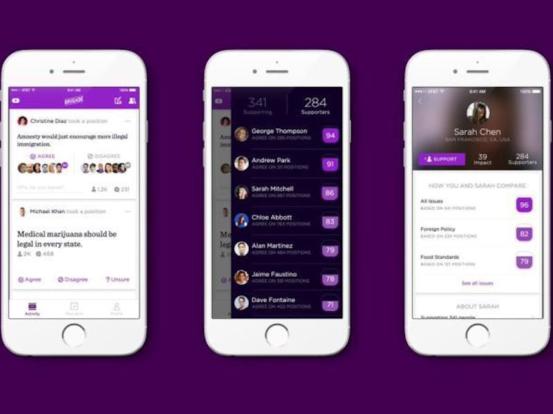 The app displays a number of cards to the user and encourages them to take a position — for instance, “Medical marijuana should be legal in every state.” You can take a side for or against, and see results from other users in the app. (It hasn’t launched yet, but the beta has about 13,000 users). You can share these results on Facebook or other social media, because that was totally what was holding people back from sharing those opinions in the first place. (Brigade —It’s your Facebook feed, but purpler! They’re hiring.)