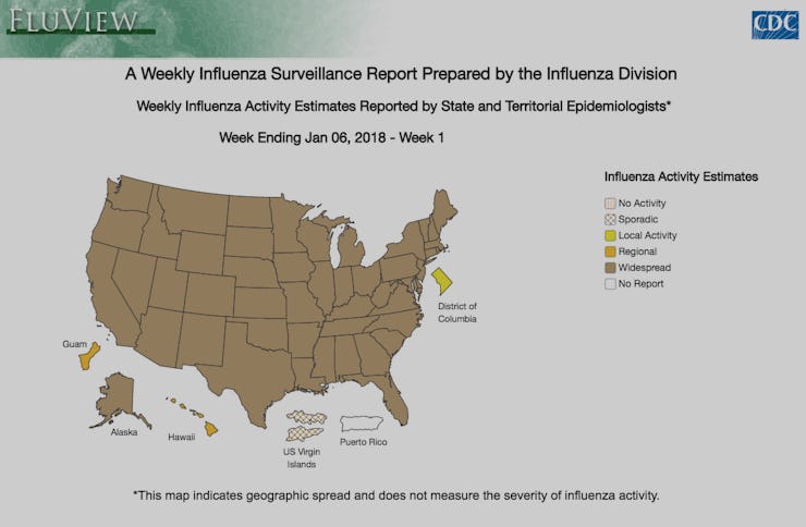 As if the numbers aren’t enough, the CDC has released a pretty wild map that shows just how fast the flu took over this season. Here’s the CDC map, which, as you can see, is pretty much all the same color, indicating the “widespread” status of the flu in most states.