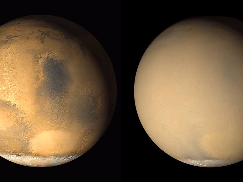 These images -- taken a month apart from each other in 2001 -- show how vastly different Mars looks when it's enveloped in a global dust storm. (Image: NASA/JPL/MSSS)