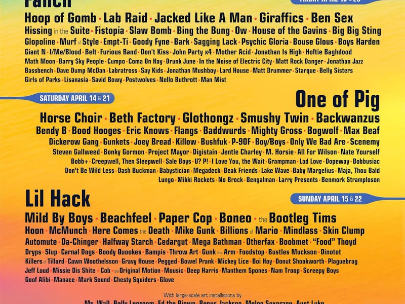 In the parallel universe where computers name popular bands, Coachella 2018 will be headlined by Fanch, One of Pig, and Lil Hack. Trop house mainstays Chesty Squiders will also make an appearance, along with prog rock darlings Manthem Spones and folk quadruplets John Party x4.