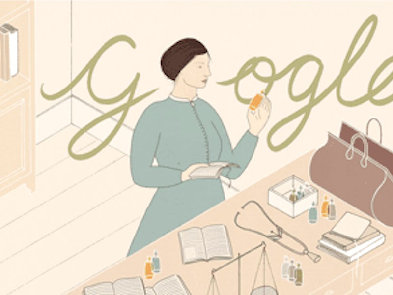 The Google Doodle of February 3 shows a woman wearing a long-sleeved blue dress with an open book in one hand and a small orange vial, which she is examining, in the other. Laid before her on a table is an open physician’s bag and doctor’s tools.