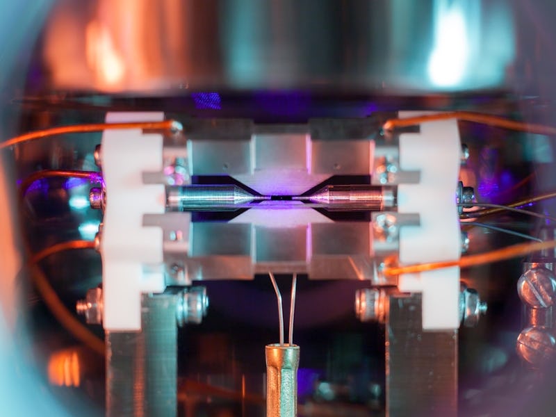 Ion traps are a family of devices that use magnetic and electric fields to capture individual charged particles (ions are just atoms that don’t have a stable number of electrons), which are useful to quantum physicists studying time and quantum computing. To prevent the atom from zooming off, the trap employs an ultra-high vacuum chamber. Nadlinger took this photo by pointing his camera through a window of this chamber, capturing the atom trapped in the 2-millimeter space between two needles.