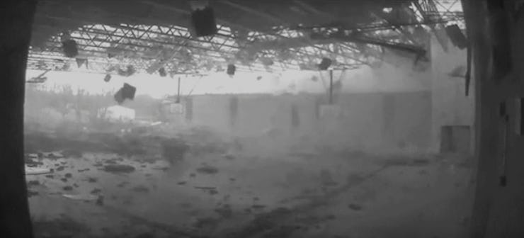 Taken from a stationary videocamera in the far corner of a school gymnasium, the video first shows the empty gym, where everything looks normal, except for a door that is flapping open. Then, the lights flicker and go off, and suddenly you can see a sliver of pale grey sky through a collapsed wall before the strong gusts blow dust throughout the space, and then, when it clears, you see that the exterior walls of the space are partially collapsed.