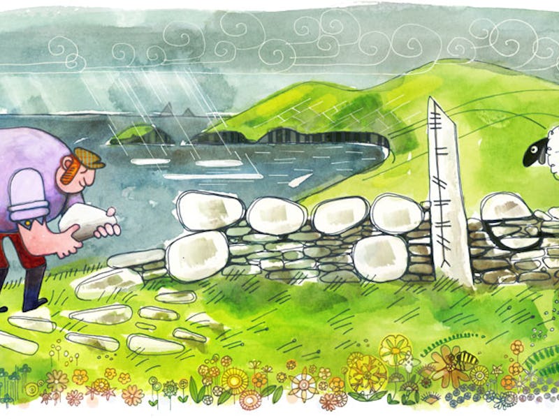 The art for today’s Doodle comes from Irish artist Ross Stewart, and it shows a stonemason working hard as a sheep looks on. Several stones in the drawing form the word “google,” but when looking closer at the letter “l,” a dozen straight lines intersecting with each other can be seen. These lines represent an ancient Irish alphabet known as Ogham.