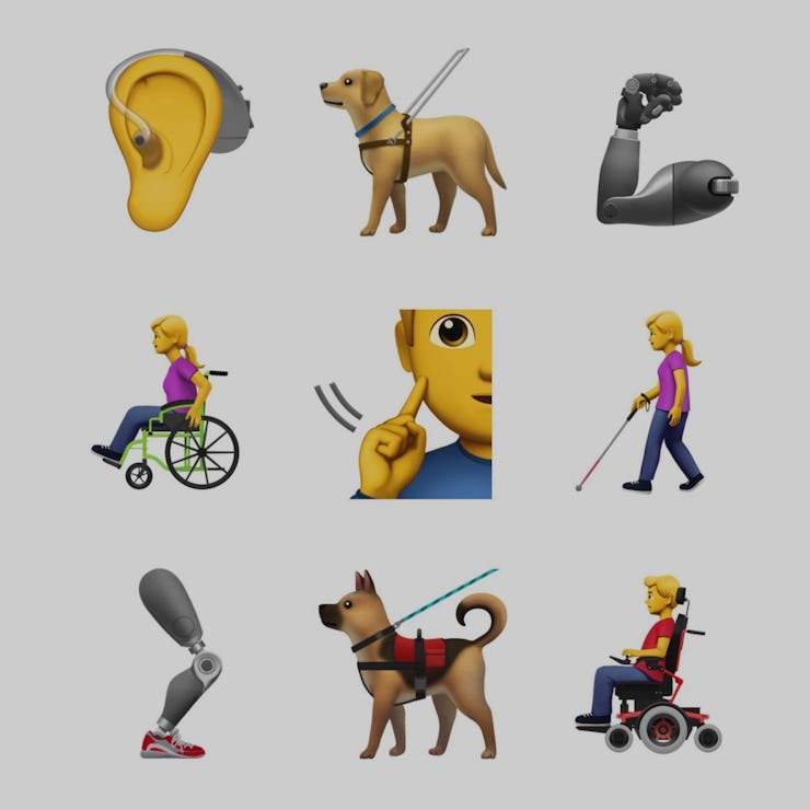 Apple proposed a category of “accessibility emoji” in the company’s submission to the Unicode Consortium on Friday. The category was developed to better represent people with disabilities and includes a suite of images ranging from hearing aids and service dogs to people in various types of wheelchairs.