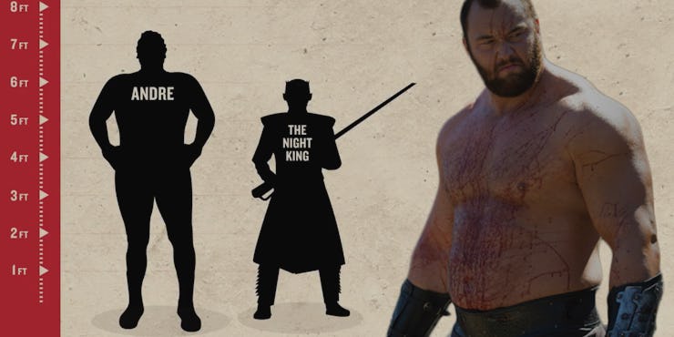 For what it’s worth, Andre, who had gigantism, would’ve still towered over his rightful opponent, Gregor Clegane, a.k.a. the Mountain. Hafþór Júlíus Björnsson, the Icelandic strongman who plays the Mountain, stands at a still-imposing 6-foot-9, so he’d maybe come up to Andre’s nose. Maybe.