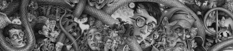 Scholastic announced the new covers on Tuesday morning. Illustrated by Brian Selznick, the new covers actually represent one continuous image that fuses together various symbols and characters from across the series. Of course, Harry himself appears in almost every single one. But you know what does appear in every single cover? Bits of snake.