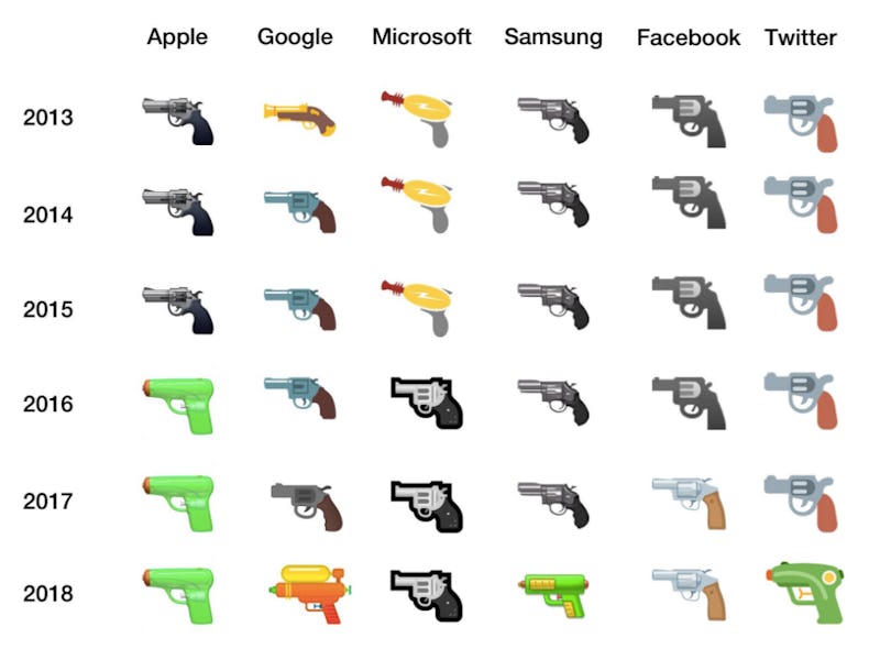 Of the six major players in emoji — Apple, Facebook, Twitter, Microsoft, Google, and Samsung — Apple was the first major tech company to introduce water guns into the emoji canon after a public push, officially swapping out their original revolver design for a neon green water gun in 2016. Samsung and Twitter followed suit earlier in 2018, also adopting similar green squirt gun emojis. With Google now on the same page, only Microsoft and Facebook still use realistic gun emojis. Microsoft used a ray gun until 2016, but has since switched to the revolver design previously favored by most companies.