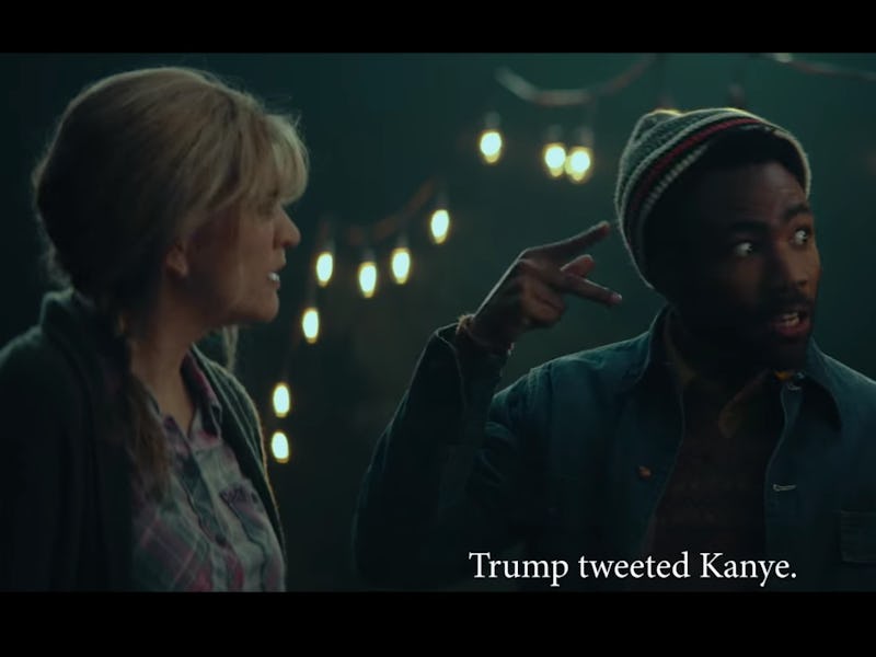 Cast members Aidy Bryant, Cecily Strong, Beck Bennet, Kenan Thompson, and host Donald Glover starred in the short that mimicked the look from A Quiet Place on Saturday’s episode. Called “A Kanye Place,” the group has to stay quiet as they make their way home. Glover, on his phone, whispers to the group that Kanye tweeted about his new “Make America Great Again” hat, which Thompson had to give a loud “Oh come on, Kanye,” which caused him to be snatched by the super-hearing monster.