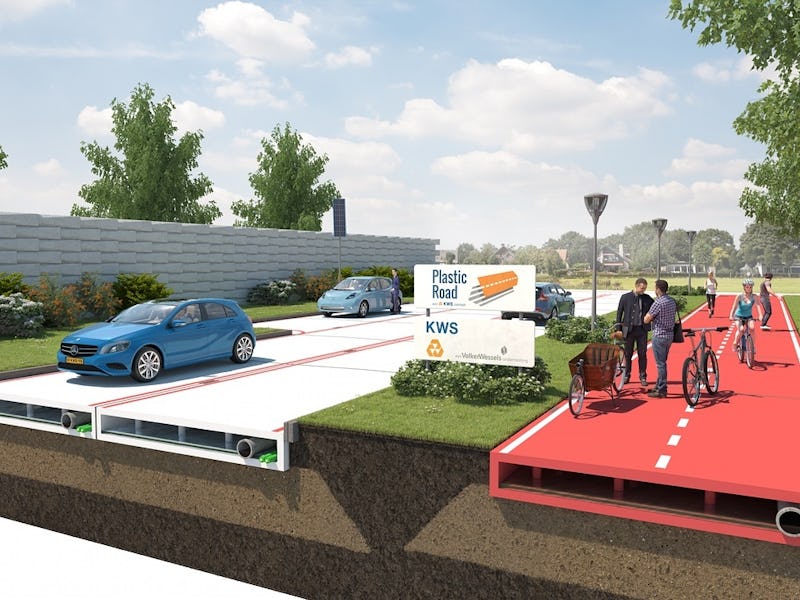 This isn’t the first idea for using plastic to build roads: An Indian chemist recently found a way to repurpose plastic waste into a polymer that can be used to make asphalt. But Dutch company VolkerWessels wants instead to make plastic roads that more closely resemble modern infrastructure. The company proposes using recycled plastic from the ocean (of which there is 5 trillion tons to pick from) and manufacturing roads in the factory, then moving them from the warehouse floor into communities where they can be easily fitted into the ground. And then, when they need to be replaced, simply yanking out the old plastic block for a new one.