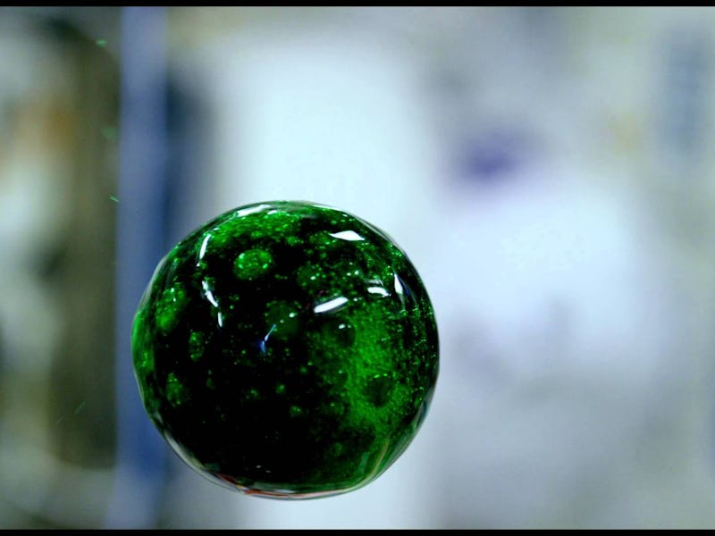 The specific piece of hardware that Kelly’s referring to here is the International Space Station’s E-K pre-treatment toilet tank. The E-K introduces astronaut urine to a mixture of water, sulfuric acid, and chromium oxide — the latter of which helps to prevent oxidation and gives the solution an alien-like (but also, maybe, less gross) purple color. The top photo on this article doesn’t actually depict the urine-acid ball but approximates what it might look like; the green orb is actually an experiment Kelly once ran on the ISS using water, green food coloring and an antacid tablet designed to visualize water’s complex physics in zero gravity.