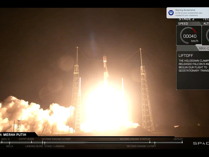 The mission launched from the Cape Canaveral Air Force Station in Florida at 1:18 a.m. Eastern time from Space Launch Complex 40. The mission deployed the Merah Putih geostationary commercial communications satellite for PT Telekom Indonesia to provide service to the country and other areas for 15 or more years, the name in Indoenesian meaning “red and white” to symbolize the colors of the national flag. The satellite deployed 32 minutes after liftoff, as the first stage rocket landed on the Of Course I Still Love You droneship in the Atlantic Ocean.