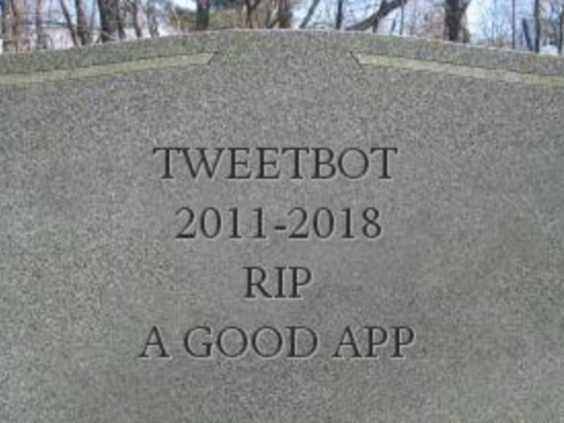 Tweetbot, 7, of Tapbots LLC, died August 15, 2018, on its Version 4.9 update on the App Store. It was born on April 14, 2015 for iPhone users, the child of Texas-based iOS developer Paul Haddad and designer Mark Jardine. It is the oldest of two siblings, Pastebot and Calcbot.