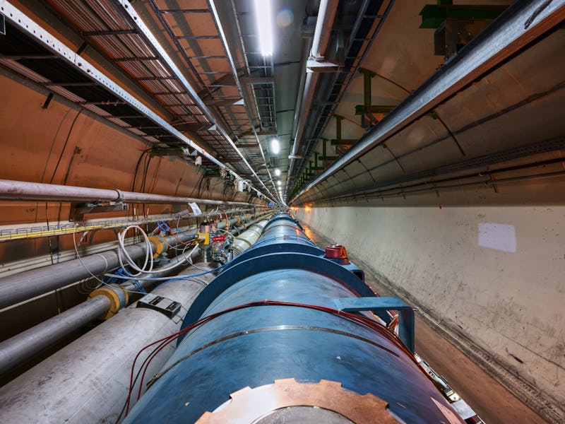 View of the LHC in its tunnel at CERN. The LHC is a 27-kilometer-long underground ring of superconducting magnets housed in this pipe-like structure, or cryostat. The cryostat is cooled by liquid helium to keep it at an operating temperature just above absolute zero. It will accelerate two counterrotating beam of protons to an energy of 7 tera-electron volts (TeV) and then bring them to collide head-on. Several detectors are being built around the LHC to detect the various particles produced by the collision.