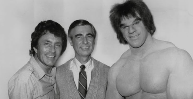 In episode 1468, which aired on February 6, 1980, Mr. Rogers leaves the Neighborhood of Make-Believe to hang out on set with Bill Bixby and Lou Ferrigno, stars of the TV show The Incredible Hulk. There, Rogers discusses how David (Bruce) Banner and the Hulk himself are still the same person and shows Ferrigno with and without his full Hulk makeup.