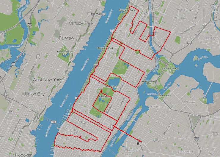 He tells Inverse he planned out his route a few weeks ago over a few hours, and if you’re looking at the map and asking how much often had to go against the flow of traffic, Zawadzki says he used the relative quiet offered by the city’s Sunday evening traffic to his advantage: He pedaled against the flow of traffic for about 15-20 percent of the ride.