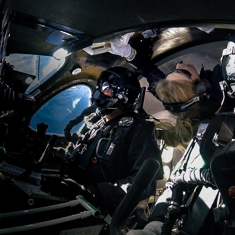 The vehicle took off from Mojave, California, shooting up before entering a period of several minutes of weightlessness. Outside the window in the photo, viewers can see the Earth rushing past below. During this several-minute period of weightlessness, Moses exited her seat to test evaluation points around the cabin, in the process making history as the first person to float without restraints on a commercial aircraft.