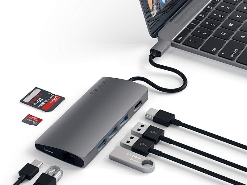 While laptop manufacturers are ready to embrace this USB C future, the adoptions for consumers is a slow drip at best. Luckily, the USB C Hub was created to provide virtually all of the older legacy ports you could ever want. There are a lot to choose from and you could run into compatibility issues along the way, but hands down one of the best options out there is the Satechi Aluminum Multi-Port Adapter V2. Ports include 4K HDMI, Ethernet, USB-C Pass-Through Charging, SD/Micro Card Reader and 3 USB 3.0 ports.