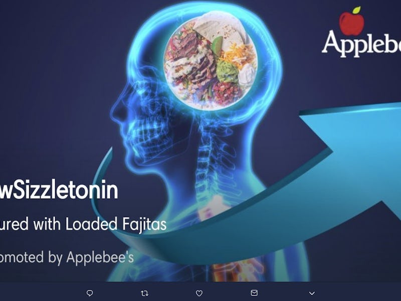 Some Twitter users who opened their feeds on Wednesday morning might have noticed an odd trending hashtag: #LowSizzletonin. Paired with a blue x-ray image of a brain, reminiscent of drug packaging or the galaxy brain meme, the hashtag was promoted by fast food chain Applebee’s to encourage customers to “Get cured with Loaded Fajitas,” a new bacon-and-queso-laden product. With May being Mental Health Awareness month, people were not amused.