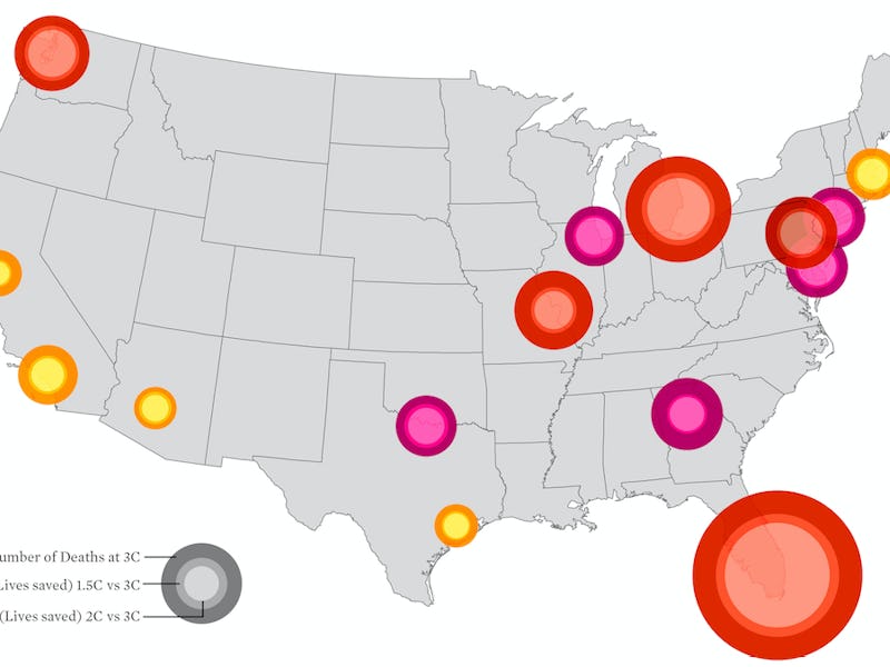 Hitting the 3-degree threshold creates a particularly dire situation for five cities: Miami, Detroit, St. Louis, Seattle, and Philadelphia. Miami will be worst off, with 520 projected heat-related deaths per 100,000 people. That’s more than double that of Detroit, Michigan, which has 204 projected deaths per 100,000. The other cities are listed below.