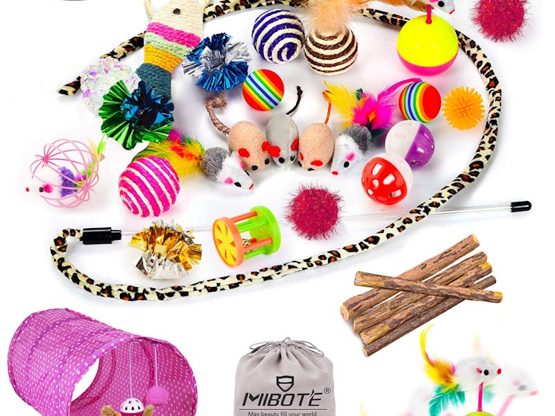 Why We Picked It You and your cat will never get bored with this 29 piece set of toys. It comes with everything from fake fur mice to an assortment of plastic balls to play with, all of which will lead to hours of play and fun.