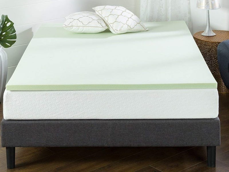 smWhy We Picked It The Zinus mattress topper is 1 ½ inches deep. The memory foam in this topper is partially made of biofoam, which uses natural plant oils. The topper has natural green tea extract, castor seed oil, and natural active charcoal that will eliminate odors and absorb moisture, keeping your bed and mattress smelling fresh — great for sweaty sleepers.