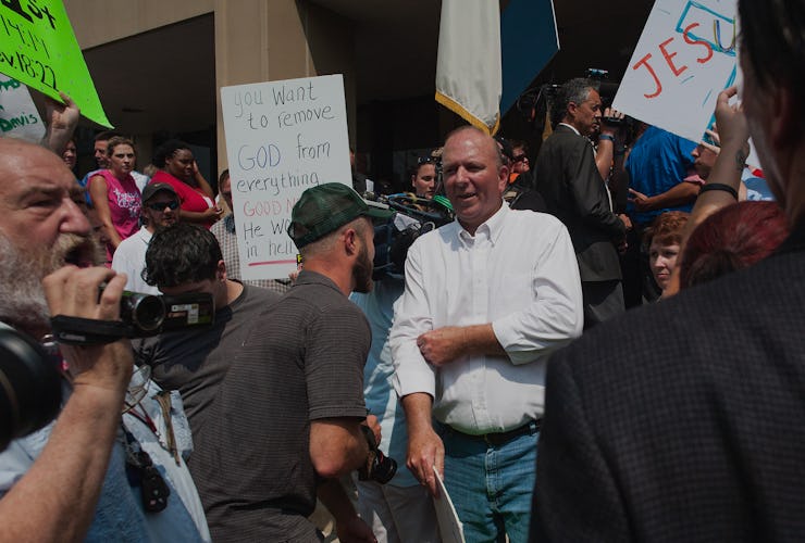 Since his wife got locked up and the county began issuing marriage licenses, Joe Davis has taken it upon himself to be the family spokesman and, boy, is he doing some job. Earlier today, Mr. Davis held up a sign outside the county courthouse that read “Welcome to Sodom and Gomorrah” — wowzers. And he’s taking to making pronouncements that would have Jesus kick a stained-glass window. “We don’t hate nobody,” David said, according to the Lexington Herald-Leader. He then gestured to marriage-equality demonstrators and said, “We just want the same rights they have. They say, ‘We’re gonna make you accept us whether you want to or not.’ Well, we don’t want all this forced on us.” Holy — holy! — shit.