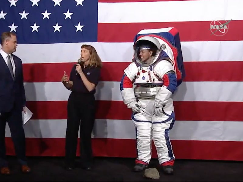 Davis demonstrated the added mobility that the new suit provides, rotating her shoulders, wiggling her fingers, and bending down to pick up a moon rock prop and awkwardly handing it to Bridenstine before walking offstage.