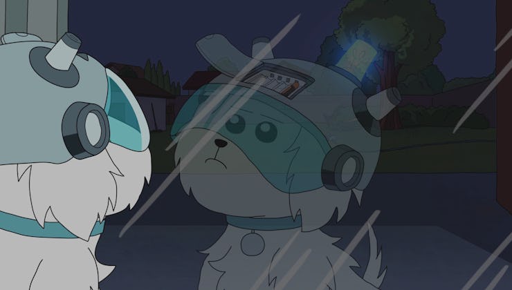 As the episode begins, Jerry watches bland television and whines about Snuffles’ lack of intelligence after the adorable pooch pees on the carpet. (Jerry: “Rick, you wouldn’t by any chance have some sort of crazy science thing you could whip up that might help make this dog a little smarter, would you?”) Rick cobbles together a helmet to increase the dog’s intelligence, inventing a way to distract the rest of the family so he can take Morty on an adventure. (Rick and Morty takes this approach to stories almost too often: see “Rixty Minutes” and “Meeseeks and Destroy,” for instance.)