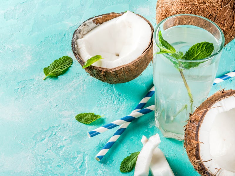 Stick to plain water. Coconut water is the “juice” of the coconut, not to be confused with its higher-fat cousin coconut milk. While it does contain some natural electrolytes — including potassium, sodium, and manganese — there is no compelling evidence it is better for rehydration than normal water. While coconut water is lower in sugar than other juices and probably fine as a treat from time to time, it still contains unnecessary liquid sugar and calories, so I would recommend sticking with plain water for both rehydration and everyday drinking.