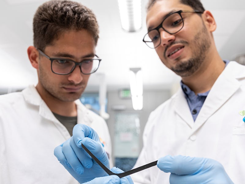 Liam Swanepole (left) and Abdullah Almansouri demonstrate the flexibility of the electronic skin.