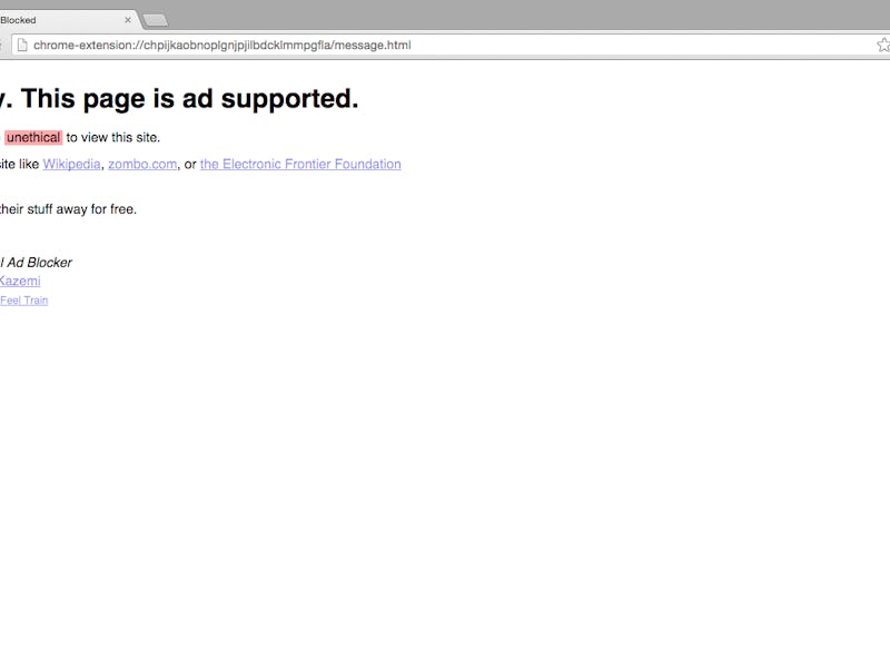 The extension does not promote functionality. It’s a statement. One that Kazemi likely hopes will get us to pause our AdBlock for good. As he writes in the extension’s description, “the user doesn’t experience ads, but they also don’t leech free content. Everybody wins.” Sarcasm noted.